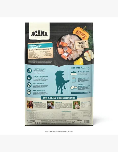 El alimento para perros ACANA™ FRESHWATER FISH BLEND está formulado para cumplir con los niveles nutricionales establecidos por los perfiles de nutrientes de alimentos para perros de la AAFCO para todas las etapas de la vida, incluido el crecimiento de perros de gran tamaño (70 lb o más en la edad adulta)