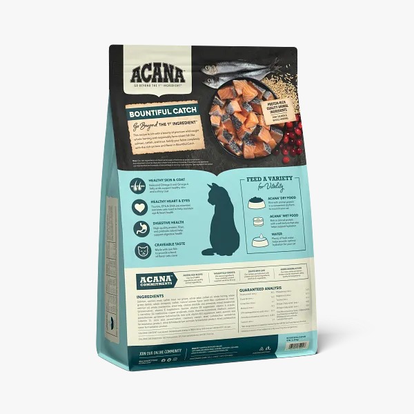 La receta de ACANA Bountiful Catch está formulada para cumplir con los niveles nutricionales establecidos por los perfiles de nutrientes de alimentos para gatos de la AAFCO para el mantenimiento de adultos.