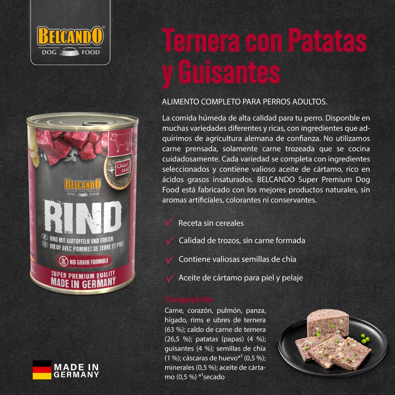La comida húmeda de alta calidad para tu perro. Disponible en muchas variedades ricas y diferentes, con ingredientes que adquirimos de agricultura alemana de confianza. No utilizamos carne prensada, solamente carne trozeada que se cocina cuidadosamente. Cada variedad se completa con ingredientes seleccionados y contiene valioso aceite de cártamo, rico en ácidos grasos insaturados. BELCANDO Super Premium Dog Food está fabricado con los mejores productos naturales, sin aromas artificiales, colorantes ni conservantes.