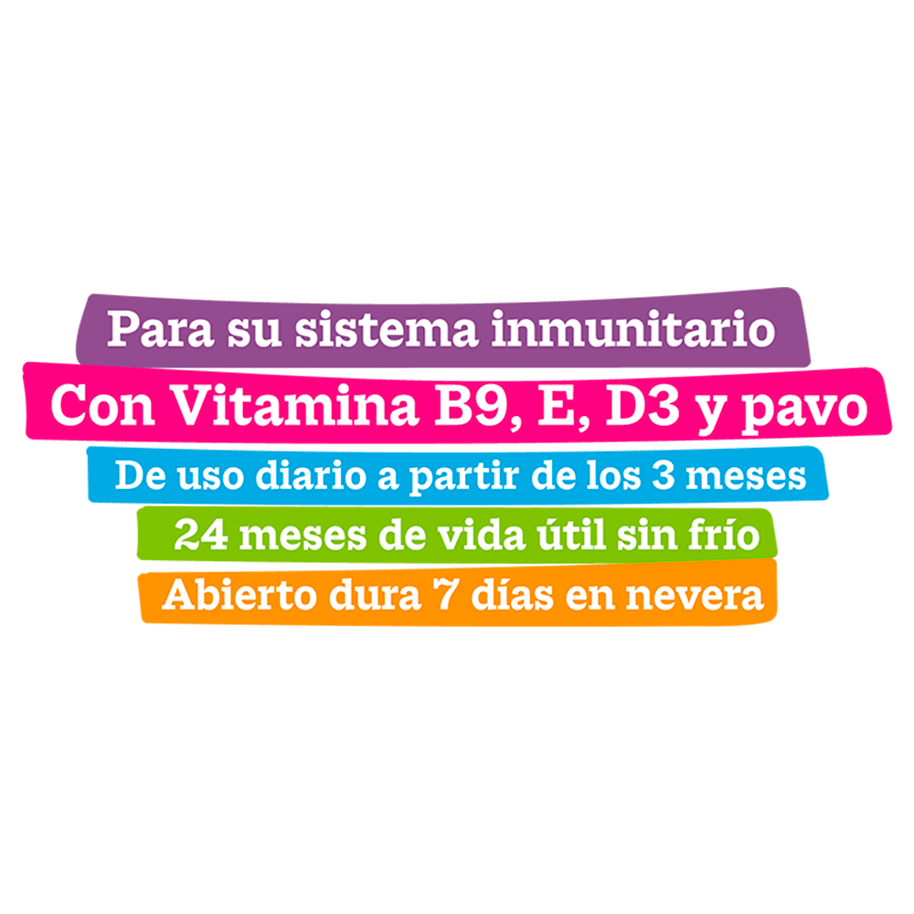 Productos lácteos fermentados (yogur sin lactosa) 90%, almidón de maíz, pavo deshuesado 3%, pectina, fructo-oligosacáridos 0,5% y Lacticaseibacillus casei (bacterias inactivas encapsuladas) 0,04%. Aditivos: Aromatizantes y Aditivos nutricionales/kg: Vitamina E (3a700) 200 UI, Vitamina D3 (3a671) 50 UI, y Ácido fólico (3a316) 50 mg.