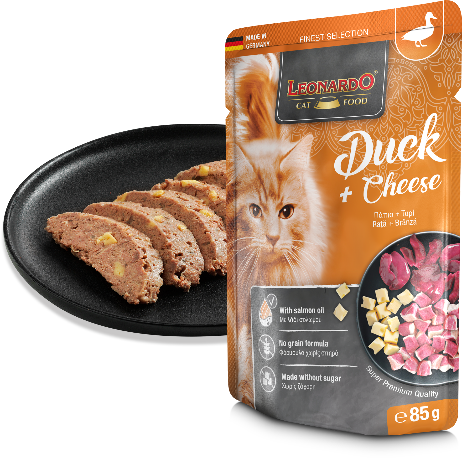 Un pequeño extra: el pato aporta mucho sabor al plato y los dados de queso ofrecen una sorpresa especialmente suculenta. Con valiosos ácidos grasos omega-3, también aumentan el bienestar de nuestros amigos de cuatro patas. Otra ventaja de LEONARDO Pato + Queso: un pelaje suave y brillante gracias a los ácidos grasos poliinsaturados del aceite de salmón.