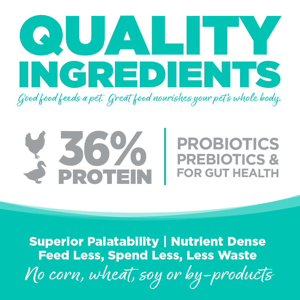Pollo, harina de pato, harina de pollo, harina de pavo, arvejas (guisantes), camote (batata), grasa de pollo (conservada con tocoferoles y ácido cítrico), garbanzos, almidón de arveja (guisante), levadura seca, sabores naturales de ave y pescado, semilla de linaza, producto de huevo deshidratado, fibra de arveja (guisante), extracto de levadura, carbonato de calcio, DL-metionina, cloruro de potasio, cloruro de colina, leche entera de cabra deshidratada, aceite de salmón (conservado con tocoferoles), taurina, sal, minerales (proteinato de hierro, proteinato de zinc, proteinato de cobre, selenito de sodio, proteinato de manganeso, yoduro de etilendiamina dihidroyodada), sulfato de calcio, vitaminas (suplemento de vitamina E, suplemento de niacina, d-pantotenato de calcio, suplemento de vitamina A, mononitrato de tiamina, suplemento de riboflavina, clorhidrato de piridoxina, biotina, suplemento de vitamina B12, suplemento de vitamina D3, ácido fólico), calabaza seca, arándanos azules secos, arándanos rojos deshidratados, harina de kelp (algas marinas) seca, inulina, levadura hidrolizada, extracto de fermentación de Aspergillus oryzae seco, extracto de fermentación de Trichoderma longibrachiatum seco, ácido láctico, levadura de cerveza seca, cúrcuma, extracto de fermentación de Aspergillus niger seco, L-ascorbil-2-polifosfato (fuente de vitamina C), cultivo de levadura, producto de fermentación de Bacillus subtilis seco, producto de fermentación de Bacillus licheniformis seco, producto de fermentación de Enterococcus faecium seco, producto de fermentación de Lactobacillus acidophilus seco, extracto de fermentación de Bacillus subtilis seco, extracto de yucca schidigera, extracto de romero.