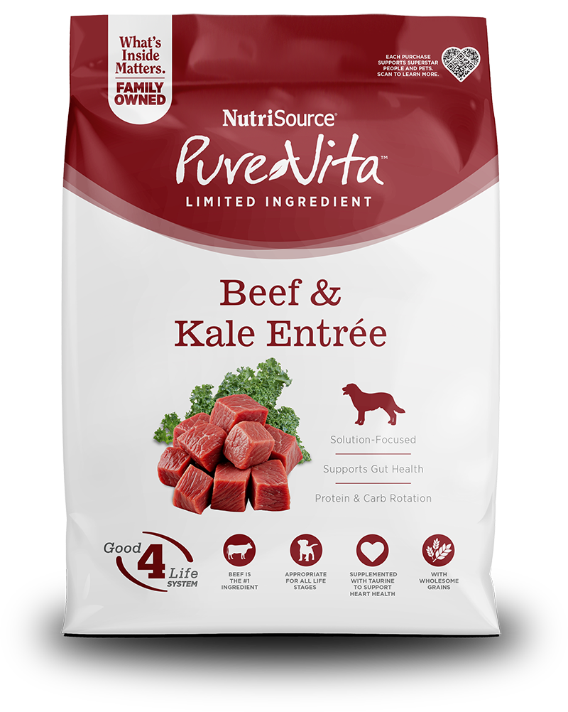- Como parte de nuestra línea de alimentos para perros que incluye granos, NutriSource® Pure Vita™ Beef & Kale Entrée está formulado para cumplir con las directrices de la AAFCO para todas las etapas de la vida.