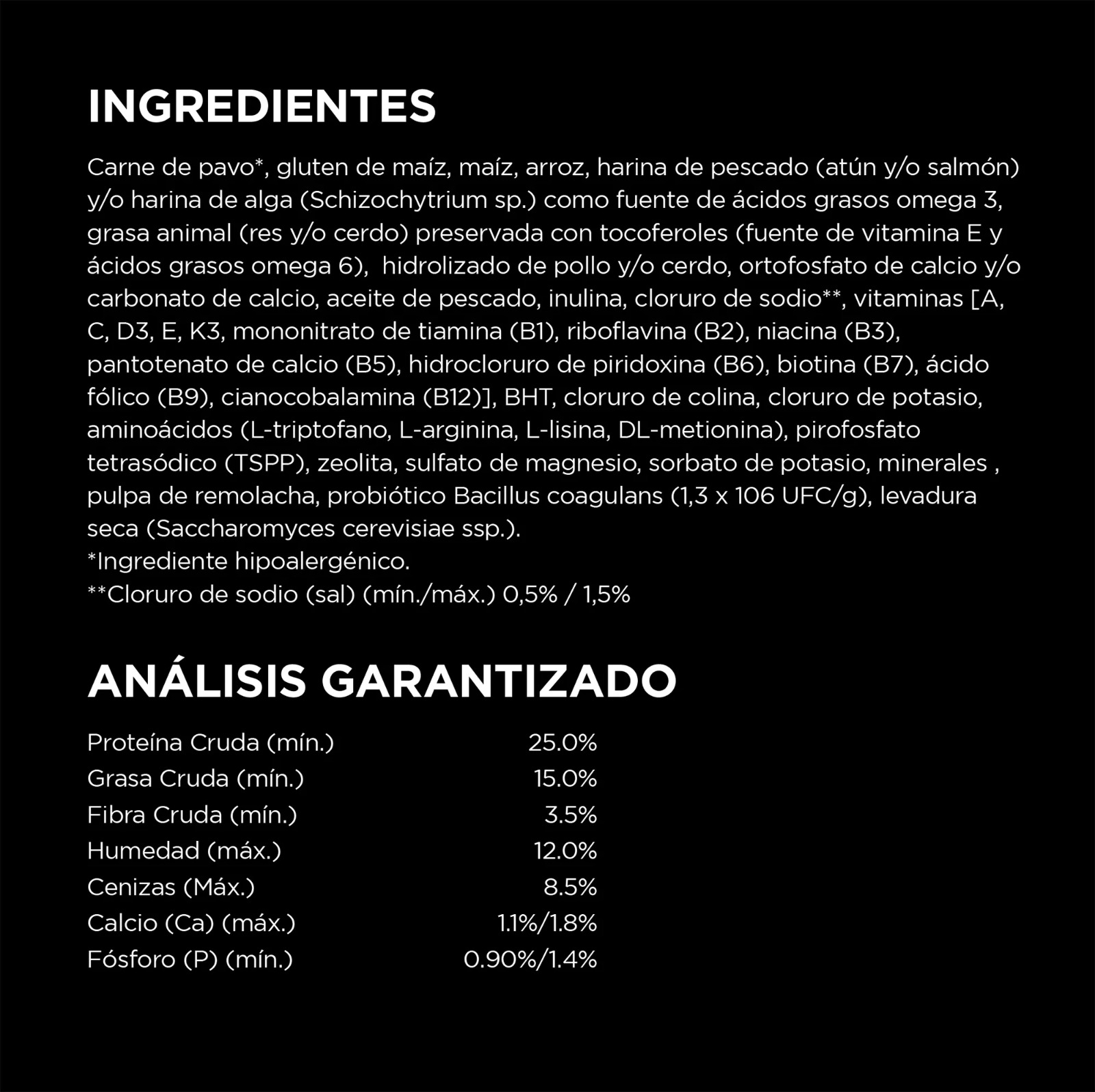 Carne de pavo*, gluten de maíz, maíz, arroz, harina de pescado (atún y/o salmón) y/o harina de alga (Schizochytrium sp.) como fuente de ácidos grasos omega 3, grasa animal (res y/o cerdo) preservada con tocoferoles (fuente de vitamina E y ácidos grasos omega 6), hidrolizado de pollo y/o cerdo, ortofosfato de calcio y/o carbonato de calcio, aceite de pescado, inulina, cloruro de sodio**, vitaminas [A, C, D3, E, K3, mononitrato de tiamina (B1), riboflavina (B2), niacina (B3), pantotenato de calcio (B5), hidrocloruro de piridoxina (B6), biotina (B7), ácido fólico (B9), cianocobalamina (B12)], BHT, cloruro de colina, cloruro de potasio, aminoácidos (L-triptofano, L-arginina, L-lisina, DL-metionina), pirofosfato tetrasódico (TSPP), zeolita, sulfato de magnesio, sorbato de potasio, minerales , pulpa de remolacha, probiótico Bacillus coagulans (1,3 x 106 UFC/g), levadura seca (Saccharomyces cerevisiae ssp.).
